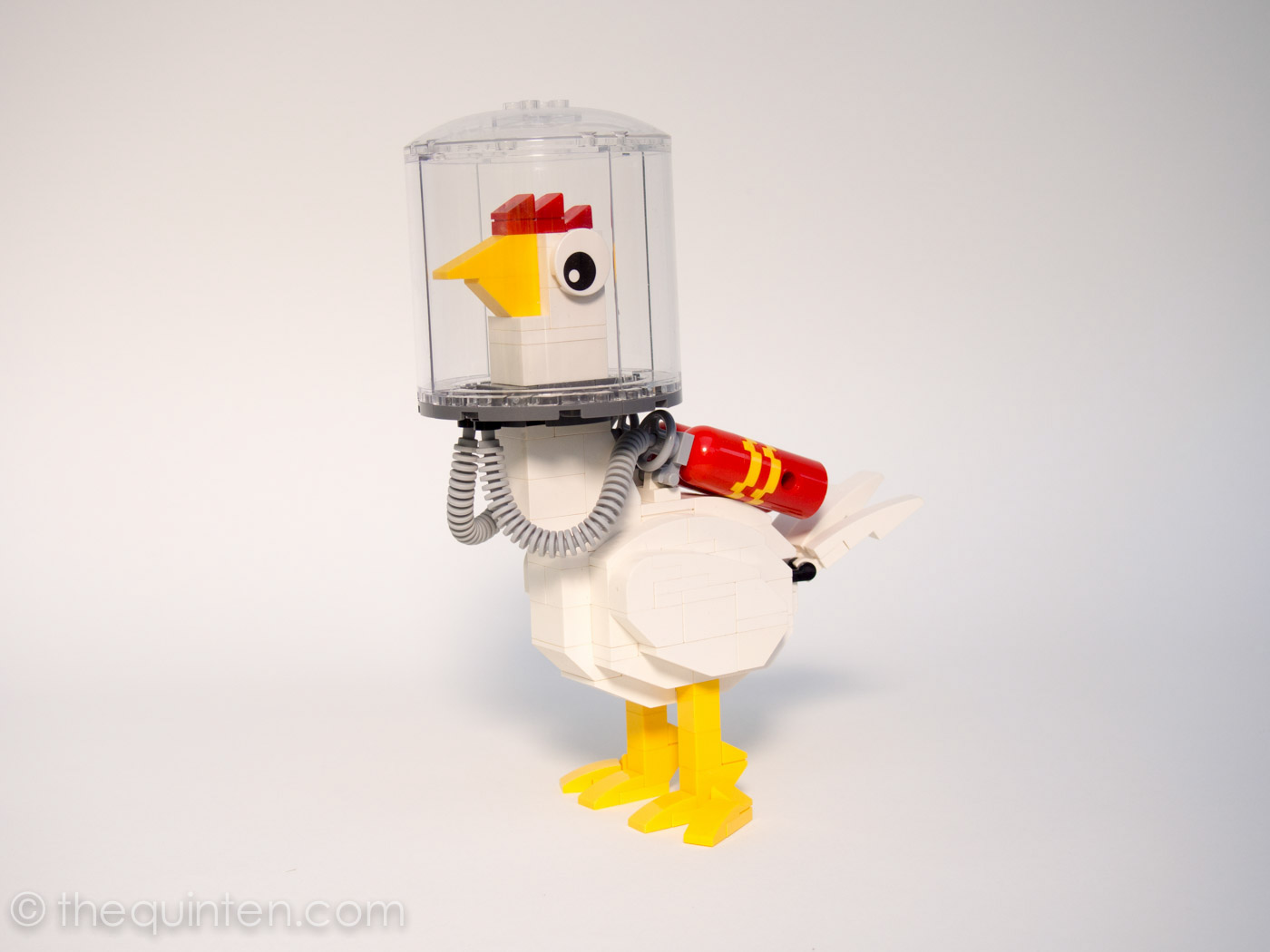 This model is a good example of how LEGO Worlds has improved my building. There is almost no SNOT building (Studs Not On Top) in this model and LEGO Worlds really helped me with this style. There is SNOT building with the air tanks and eyes but this gives Space Chicken some well deserved character. I believe a good balance between both styles is great.