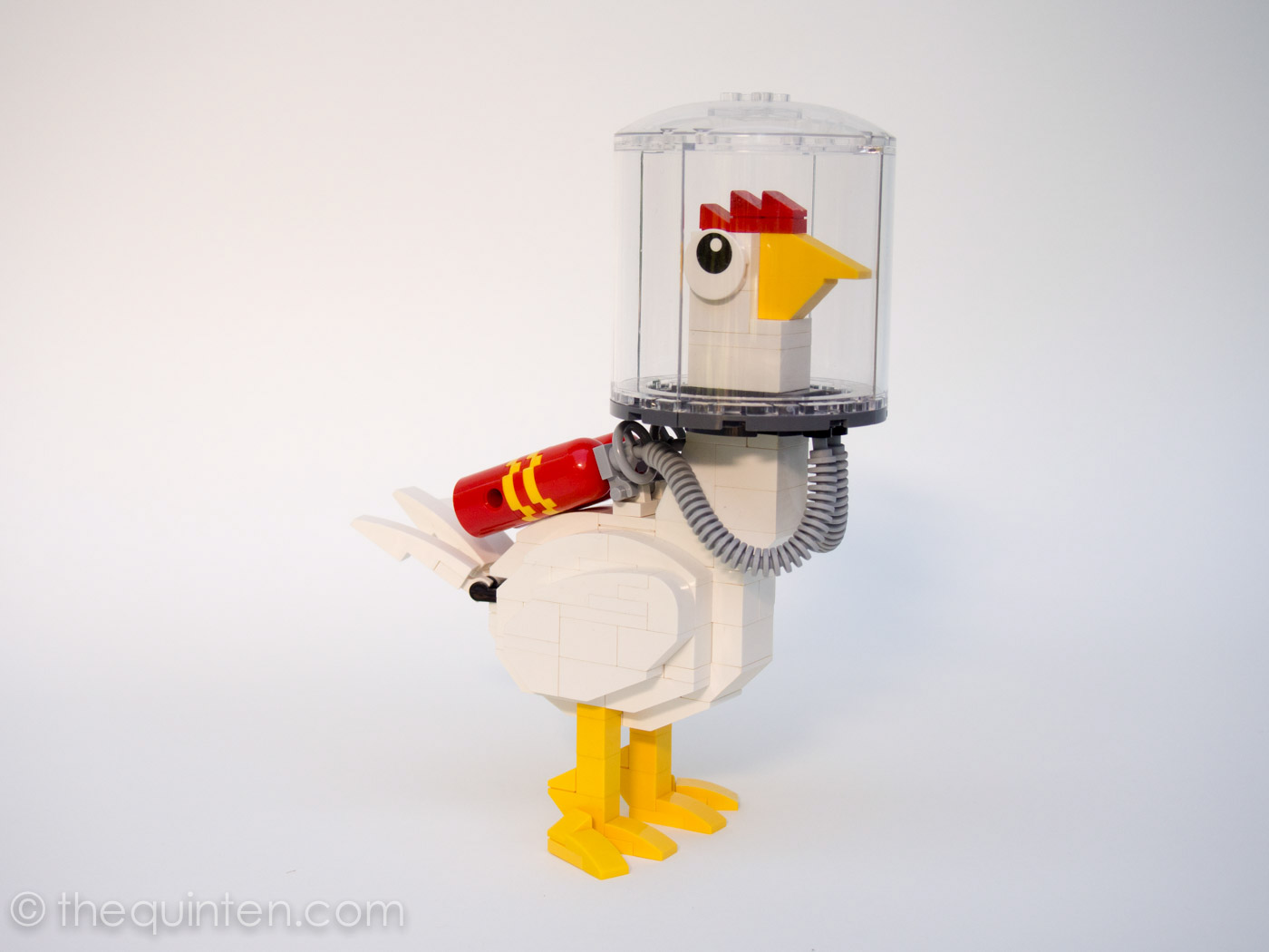 This model is a good example of how LEGO Worlds has improved my building. There is almost no SNOT building (Studs Not On Top) in this model and LEGO Worlds really helped me with this style. There is SNOT building with the air tanks and eyes but this gives Space Chicken some well deserved character. I believe a good balance between both styles is great.